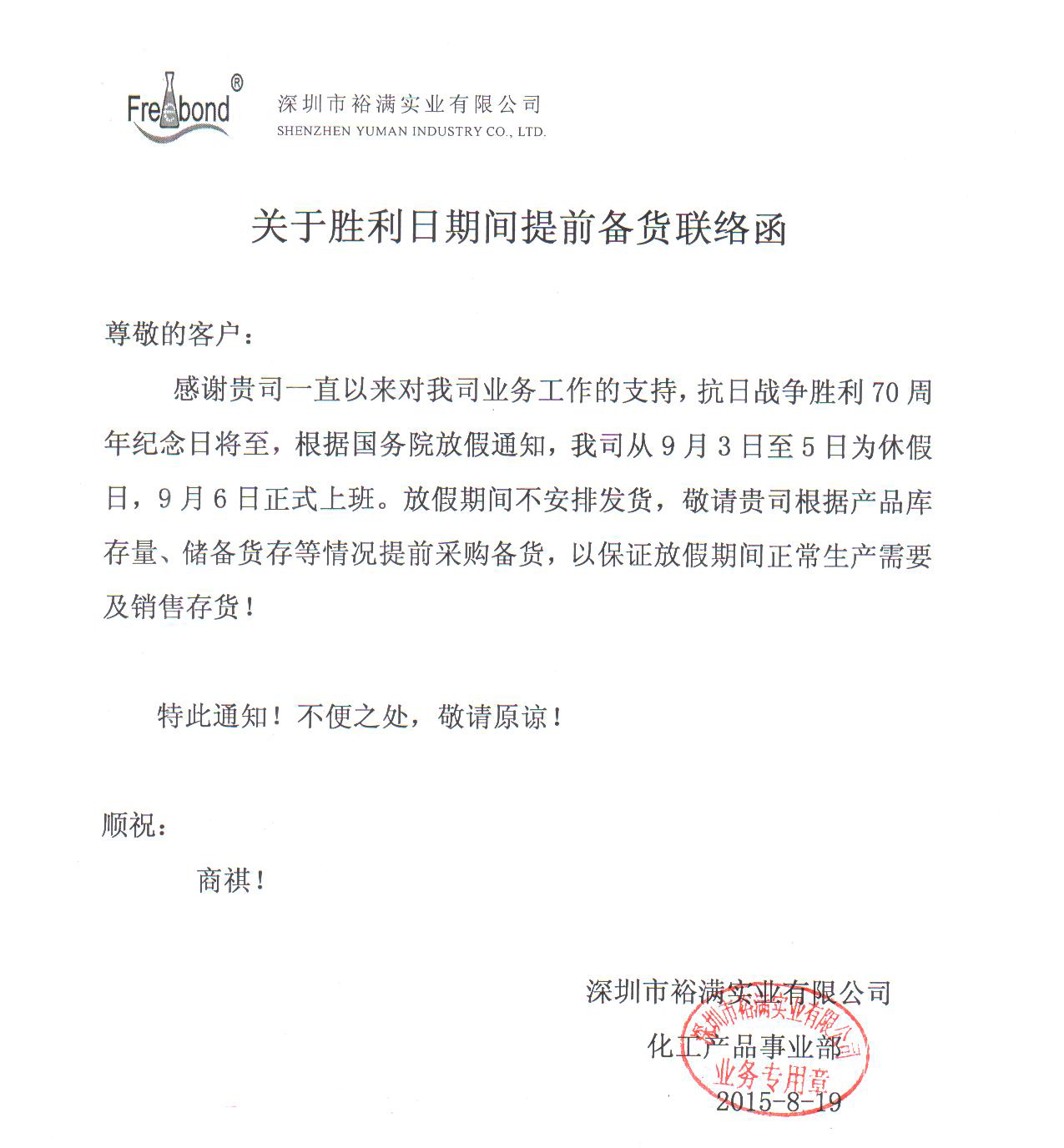 感謝貴司一直以來對我司業(yè)務(wù)工作的支持。勝利紀念日假期將至, 根據(jù)國務(wù)院關(guān)于中國人民抗日戰(zhàn)爭暨世界反法西斯戰(zhàn)爭勝利70周年紀念日調(diào)休放假的通知,我司從2015年9月3日至9月5日為休假日,共3天,6日正式上班。煩敬請貴司根據(jù)產(chǎn)品庫存量、儲備貨存等情況提前做出采購備貨,以保證放假期間正常生產(chǎn)需要及銷售存貨!