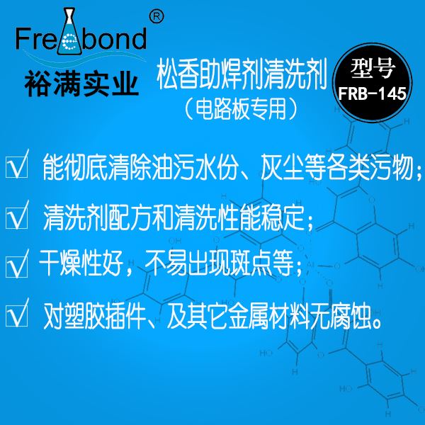 快干無鉛助焊劑清洗劑|快干無鉛松香清洗劑|裕滿清洗劑FRB-145是一款用于清洗精密電路板和電子元件表面松香、助焊劑、油污、塵埃等各類污物的無鉛清洗劑,本品具有安全、無鉛、清洗力強、性能穩定、無腐蝕、成本低等優點。