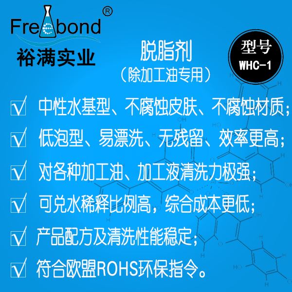中性脫脂劑|中性除油劑|中性清洗劑|裕滿清洗劑WHC-1是一款以表面活性劑為主要成份的水基清洗劑;本品能夠徹底的清除工件表面的各種加工油、加工液等臟污,具有清洗力強、性能穩定、低泡型易漂洗、綜合成本低、不腐蝕材質等優點。