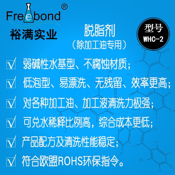 弱堿性脫脂劑|弱堿性除油劑|弱堿性清洗劑|裕滿清洗劑WHC-2是一款以表面活性劑為主要成份的水基清洗劑;本品能夠徹底的清除工件表面的各種加工油、加工液等臟污,具有清洗力強、性能穩定、低泡型易漂洗、綜合成本低、不腐蝕材質等優點。