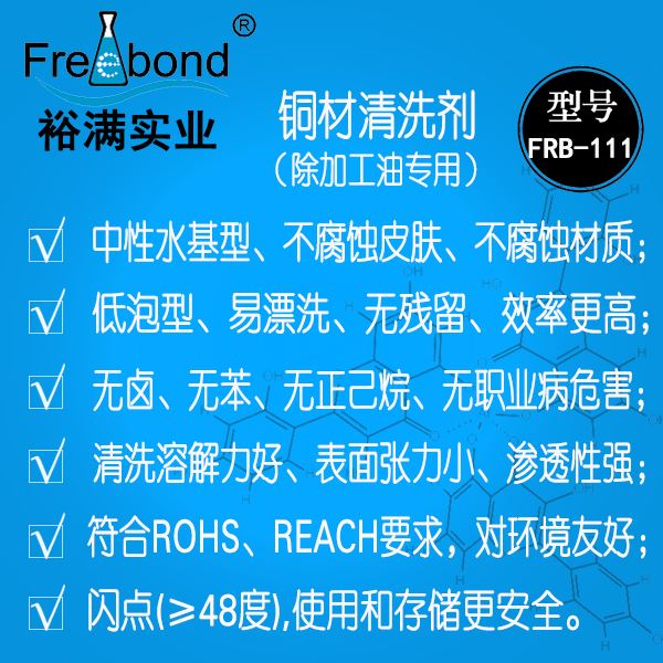 碳氫銅材清洗劑|碳氫銅材脫脂劑|碳氫銅材除油劑|裕滿清洗劑 FRB-111是用于清洗金屬生產加工制造過程中表面殘留加工油、塵埃等各類污物的無毒環保清洗劑,本品具有清洗力強、清洗性能穩定、對材質無腐蝕、環保安全、無毒無害、綜合成本低等優點。