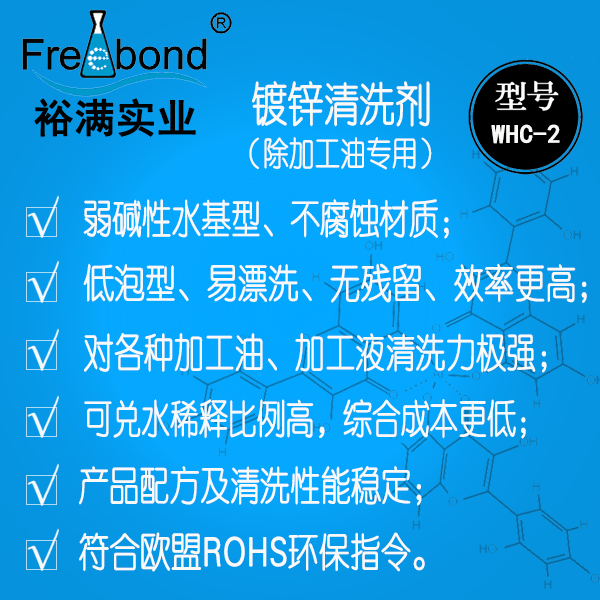 弱堿性鍍鋅板清洗劑|弱堿性鍍鋅板脫脂除油劑|裕滿清洗劑WHC-2是一款以表面活性劑為主要成份的水基清洗劑;本品能夠徹底的清除工件表面的各種加工油、加工液等臟污,具有清洗力強、性能穩定、低泡型易漂洗、綜合成本低、不腐蝕材質等優點。