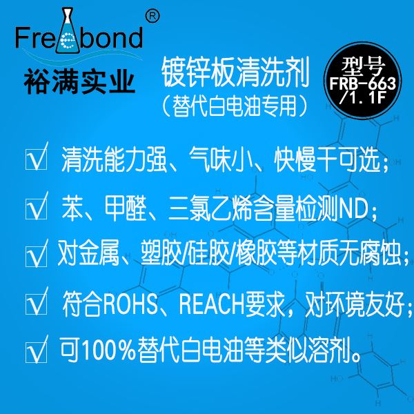 鍍鋅板表面擦拭劑|鍍鋅板表面擦拭清洗劑|裕滿清洗劑FRB-663/FRB-1.1F是一種用于替代白電油等正己烷類溶劑的環保清洗劑;本品不僅具有正己烷類溶劑良好的清洗力,還可降低職工正己烷等化學品急性和慢性中毒危害。