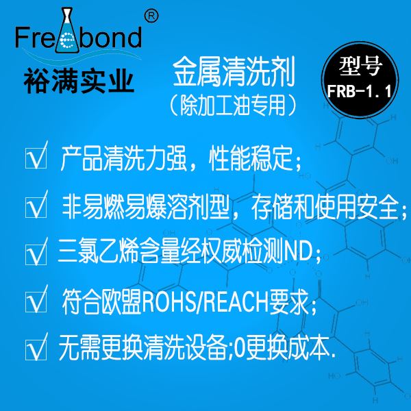 溶劑金屬清洗劑|溶劑金屬脫脂劑|溶劑金屬除油劑|裕滿清洗劑FRB-1.1 是一款替代三氯乙烯、三氯乙烷用于清洗金屬生產加工制造過程中表面殘留加工油、加工液、蠟脂的環保清洗劑,本系列產品具有清洗力強、清洗性能穩定、對材質無腐蝕、環保安全、綜合成本低等優點。