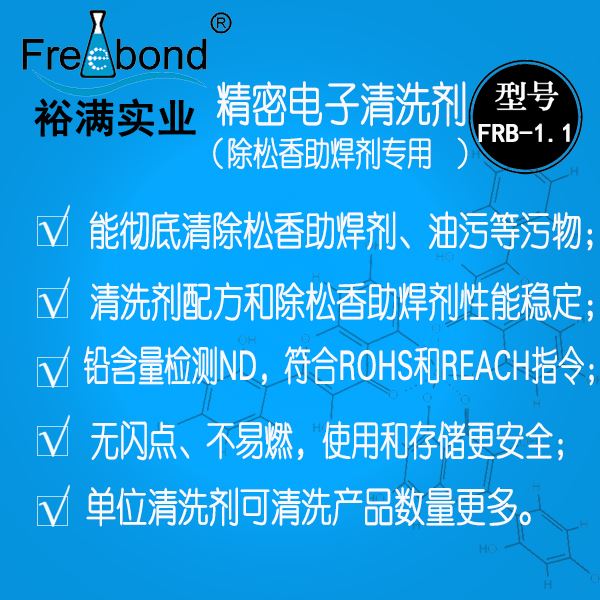 無鉛環保電子清洗劑|精密電子清洗劑|裕滿清洗劑FRB-1.1是一款替代三氯乙烯,三氯乙烷用于清洗松香、助焊劑、油污等各類污物的清洗劑;本品清洗力強、除松香性能穩定、環保無鉛、不易燃、無腐蝕、綜合成本低等優點。