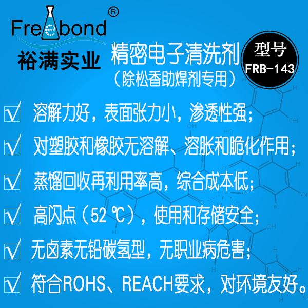 無鉛環保電子清洗劑|無鹵精密電子清洗劑|裕滿清洗劑FRB-143是一款用于清洗松香、助焊劑、油污、塵埃等各類污物的環保碳氫清洗劑;本品是替代三氯乙烯、二氯甲烷等鹵代烴的健康環保清洗劑。