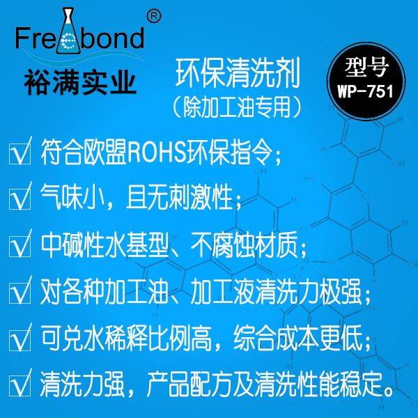 裕滿 堿性水基環(huán)保清洗劑 | 堿性水基環(huán)保脫脂除油劑 WP-751 是一款以表面活性劑為主要成份;用于清洗工件表面的各種加工油、加工液等臟污;具有氣味小且無刺激性,符合歐盟ROSH環(huán)保指令,清洗力強(qiáng)且性能穩(wěn)定、綜合成本低、不腐蝕材質(zhì)等優(yōu)點(diǎn)。